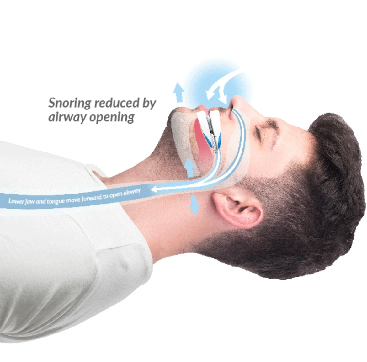 It gently repositions your lower jaw to open the airway, reducing the throat vibrations that cause snoring. This helps you breathe easier and sleep quietly through the night.